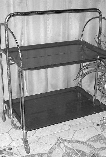 In den 60er-Jahren durfte der Servierwagen in keinem Haushalt fehlen und wurde, wie sein Name schon sagt, vorrangig zum Servieren von Speisen und Getränken genutzt. Das bekannteste Modell ist wohl der Dinett von Bremshey, ein Design aus dem Jahr 1955. Auf dem doppelstöckigen Servierwagen auf vier Rollen wurde damals der Sonntagsbraten aus der Küche an den Esstisch gefahren. Hatte er seinen Dienst erfüllt, wurde er mittig zusammengeklappt und verschwand unauffällig hinter der Küchentüre.