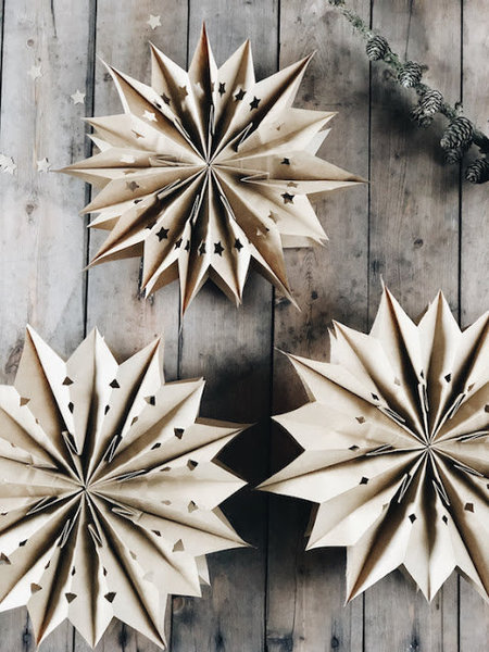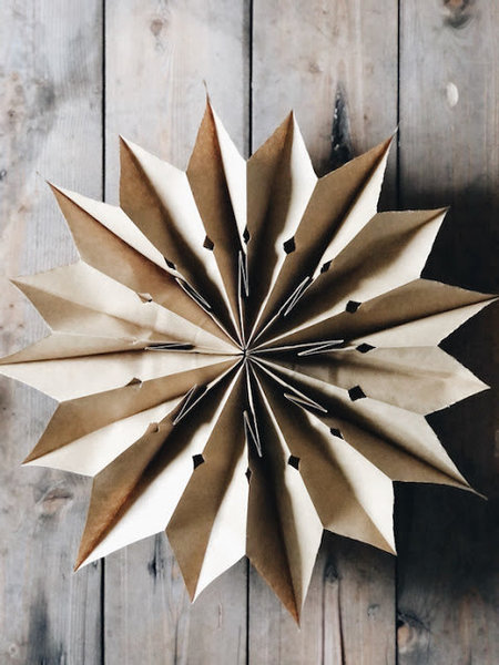 Fertig sind die hübschen Papiersterne! Um sie aufzuhängen, wird am Ende noch ein Loch in die Sternspitze gestanzt und eine Schnur oder ein Faden durchgezogen.