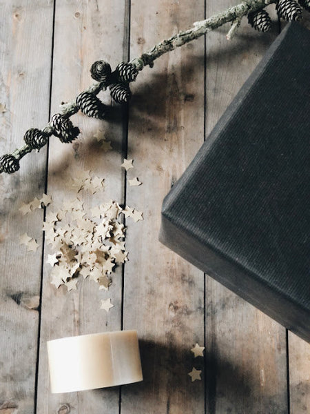 Die Papierreste der Weihnachtssterne nicht wegschmeißen! Die ausgestanzten Sterne können für eine weihnachtliche Geschenkverpackung weiterverwendet werden. Hier benötigt ihr, neben eurem Weihnachtsgeschenk und den Sternen, noch ein breites transparentes Klebeband.