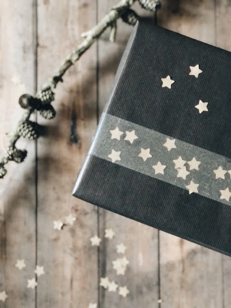 Das Weihnachtsgeschenk zunächst in Papier verpacken. Dann die ausgestanzten Sterne mit dem Klebeband auf dem Geschenk fixieren – und fertig ist das selbst gemachte Geschenkband!