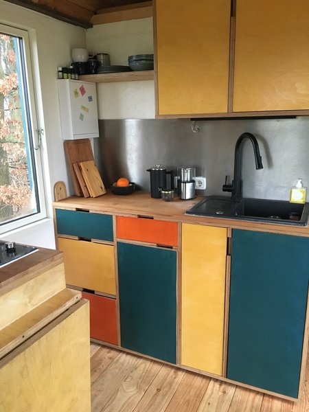 Wir haben von vornherein Stauraum eingeplant, als wir noch nicht einmal den Holzständerbau fertig hatten. Das hat geholfen, später nicht nach Stauraum suchen zu müssen, der in einem so kleinen Raum nicht mal eben geschaffen werden kann.