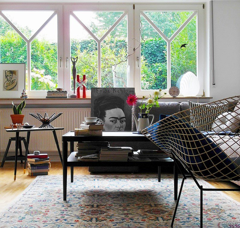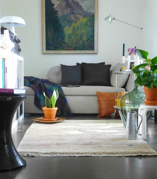 adelantes Zuhause ist nicht puristisch, sondern ein Konglomerat aus Designklassikern und belebten Stücken, die in ihrem Kontext durchaus wieder zeitgemäß und modern wirken. Kunst schleicht sich ausdrucksstark in die Szenerie, Textilien vermitteln Wärme und Isa den "Betrachtern" einfach ein Gefühl des Willkommenseins ...