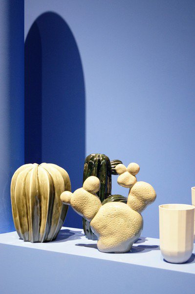 Ein Keramik Krokodil auf einem Mosaiktisch bei Gervasoni und Keramik Kakteen bei Hay.