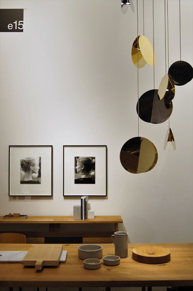 Tolle Mischung bei e15: Keramik aus der Salina Steinzeug-Keramikserie, Geflecht beim Stuhl Karnak von Ferdinand Kramer, Backenzahn aus Eiche und Portraits von der König Galerie und es darf auch glänzen, die schönen Hängeleuchten North von Besau Marguerre.