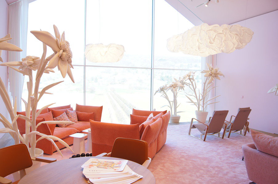 Der Gedanke hinter dem Rosa: Vitra’s “männliche” Klassiker bis hin zu den zeitgenössischen Entwürfen, wurden in rosa gekleidet und der “männlichen” Architektur des Vitra Hauses entgegengesetzt. Mutig, leicht und so wie India selbst: ironisch, humorvoll mit einem Hauch Glamour.