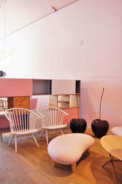 Das Mariposa Sofa von Barber & Osgerby, das Sofa Alcove und der Slow Chair von den Brüdern Bouroullec, Citterio´s Suita Sofa, der SP Stuhl und Sessel Cité von Prouvé, die Stehleuchte BB3-33S von Akari und das Freeform Sofa von Isamu Noguchi, alles wurde einfach in einen rosa Farbtopf getunkt. Die Don Giovanni Tischleuchte, Kissen und der Hocker Bishop aus Keramik sind Entwürfe der Designerin India Mahdavi, die es in Deutschland nur im The Corner Berlin zu kaufen gibt.