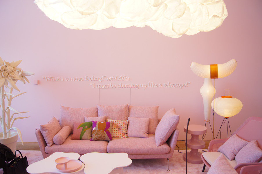 Einen freudiges “Ohhhh” ging durch den Raum, als sich die Fahrstuhltür im letzten Stockwerk des VitraHauses öffnete und einen ersten Einblick in Alice’s Zuhause gewährte. Zu erstaunlich war der in helles Rosa getünchte Raum, als dass er einen hätte unberührt lassen können. Das Wetter hätte nicht passender sein können, die Sonne tauchte das von der Pariser Stardesignerin India Mahdavi gestaltete Vitra Loft in ein warm wohliges Licht. Es fühlte sich weich an, wie in einer Zuckerwattenwolke, der Raum umschließt einen, er weckt Emotionen und entführte uns kurz in eine andere Welt.