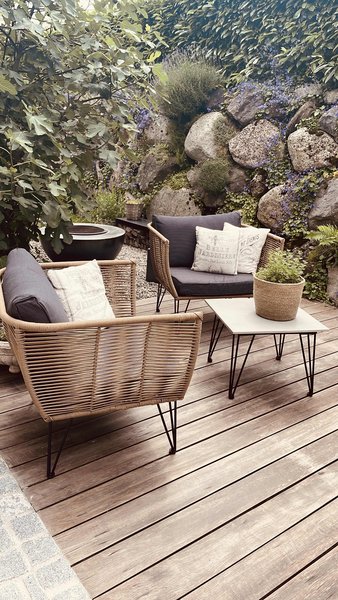 Eine Bank mit dahinter angebrachter Holzlattenvertäfelung sorgt auf der Terrasse von @blaupause für eine gemütliche Sitzecke. Korbstühle und ein großer Bambus schenken der Terrasse von @Kathi H. im Handumdrehen einladende Wohnlichkeit.