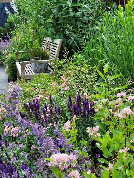 Die Holzbank war das erste Stück, das in den Garten von @EvaWaSa eingezogen ist, nachdem sie selbst ins Eigenheim zog. Von hier lässt sich wunderbar der stetige Wechsel der Pflanzen beobachten. Hinter dem Sofa von @Frida Gedöns erblüht seit Kurzem eine Blumenwiese in Form der neuen Tapete.
