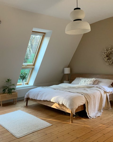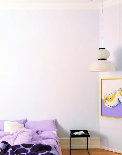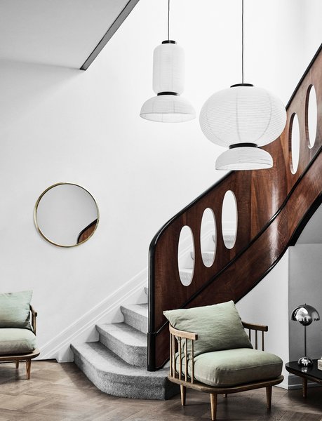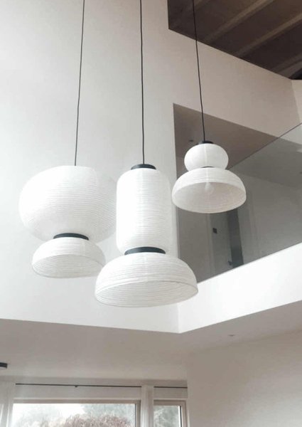 Die Pendelleuchten Formakami JH3 und Formakami JH5 von &Tradition werden aus handgemachtem Reispapier mit Eichenholzringen gefertigt. (Links: PR-Bild, rechts im Schlafzimmer bei @VillaWalther )